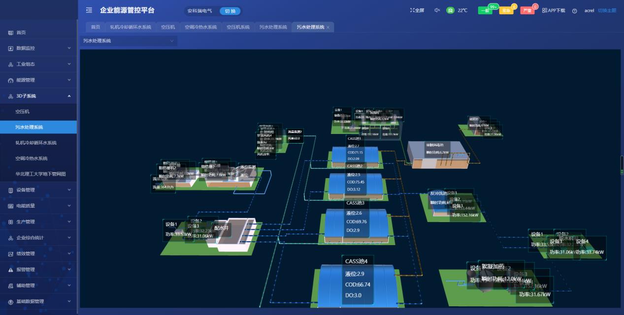 监测变压器、水泵、鼓风机的电流、电压、有功/无功功率、功率因数、负荷率、温度、三相平衡、异常报警等数据。