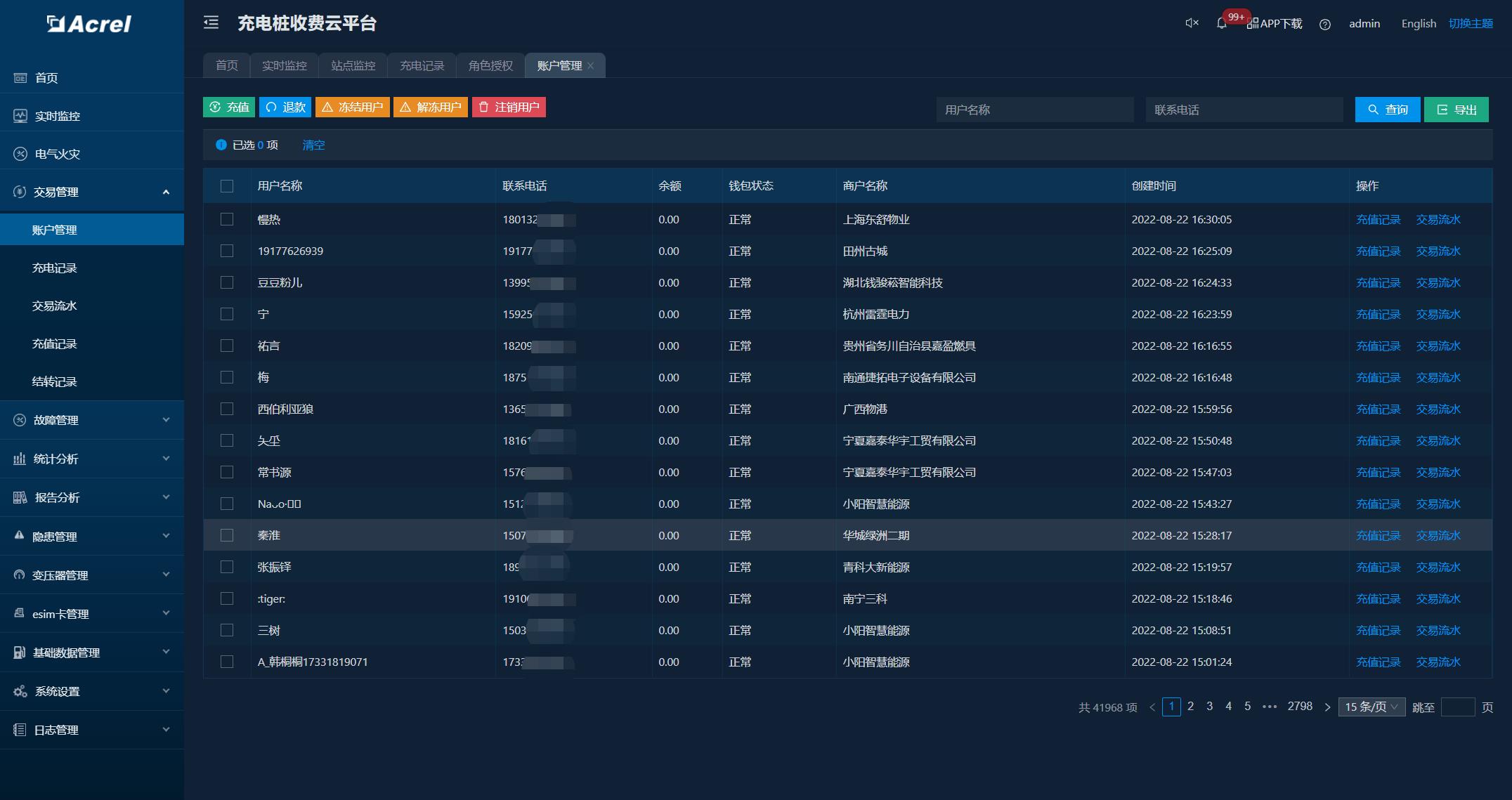 平台管理人员可管理充电用户账户,对其进行账户进行充值、退款、冻结、注销等操作,可查看小区用户每日的充电交易详细信息。