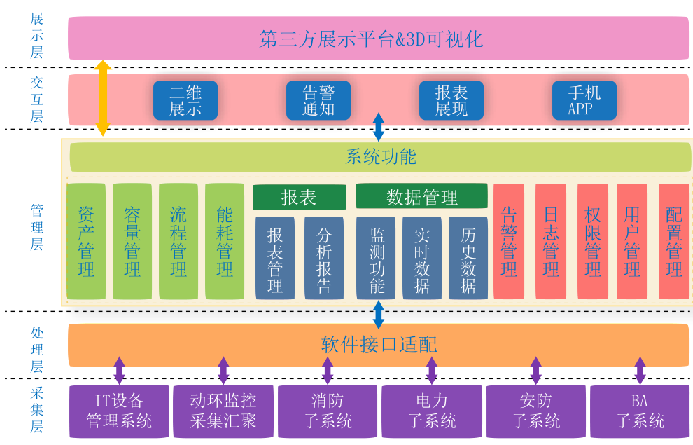 管理架构分为采集层、处理层、管理层、交互展示层四个层次。