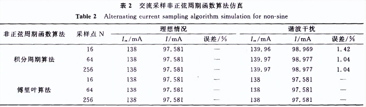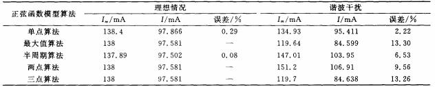 其基波幅值A1=138,分别对各种算法在理想情况下A3=A5=A7=A9=0与引入电网中奇次谐波A3=22.3,A5=6.4,A7=3.2,A9=0.5两种情况进行仿真。电流幅值Im=138mA,有效值I=97.581mA。表1与表2分别给出f=50Hz时正弦函数模型算法与非正弦周期函数模型算法的交流采样仿真结果。