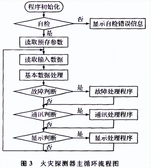 图3为火灾探测器主程序流程图,根据主函数循环与程序设计思路,可将主程序分为初始化模块、数据处理模块、故障处理模块、主显示模块与通信模块。系统经上电初始化无误后对