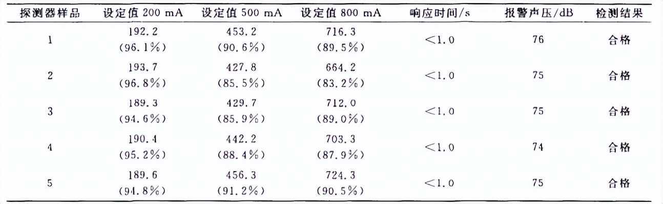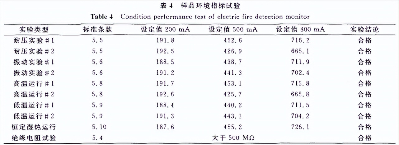 电气火灾探测器测试方法参照现行国家标准规定,对探测器样品的绝缘、耐压及振动等一系列指标进行了试验,结果见表4。