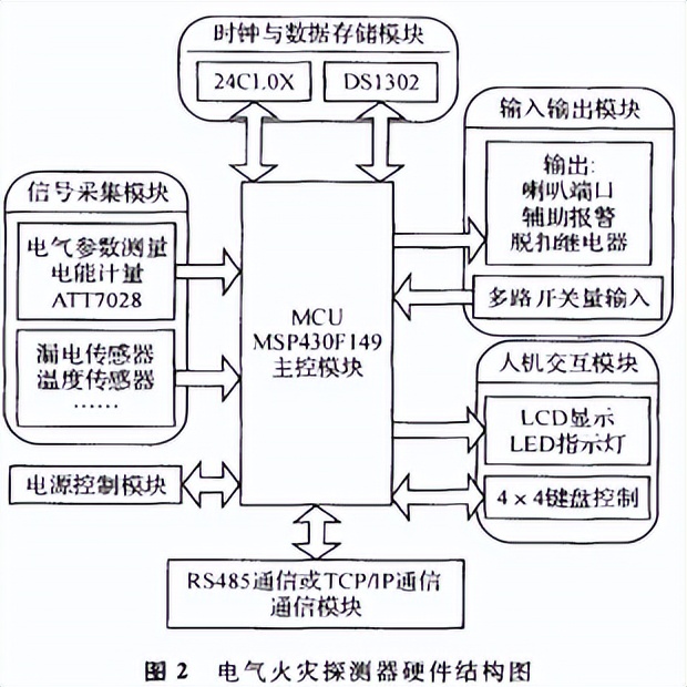 根据探测器功能设计进行模块分类,如图2所示,除微处理器MSP430的主控模块外,可将图2中电气火灾探测器设计大致分为信号采集模块、时钟与数据存储模块、人机交互模块、输入输出模块、通信模块与电源控制模块六部分。
