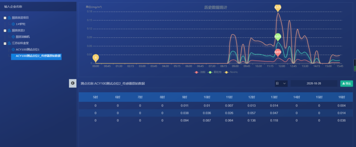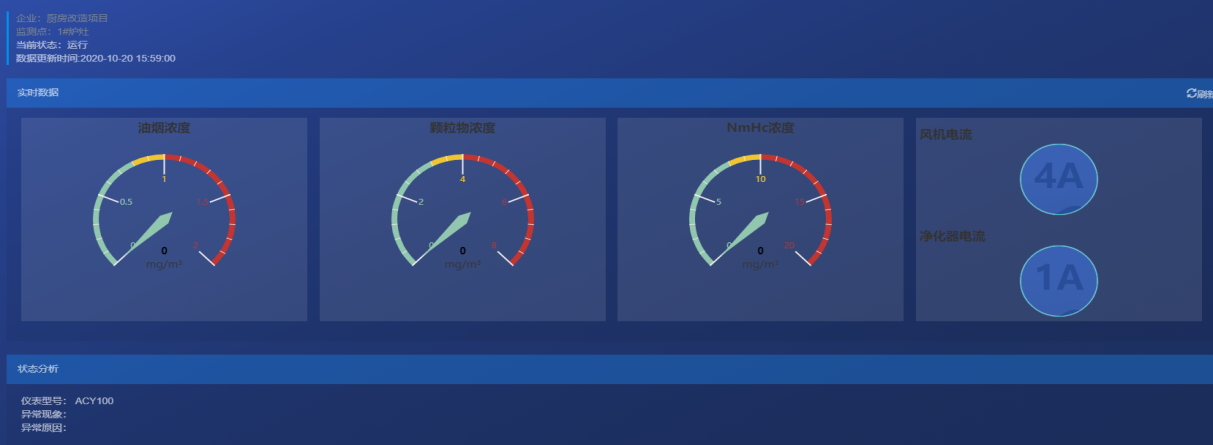 实时监测数据包括油烟净化器和风机的运行电流,油烟浓度、颗粒物浓度和NMHC浓度等信息。