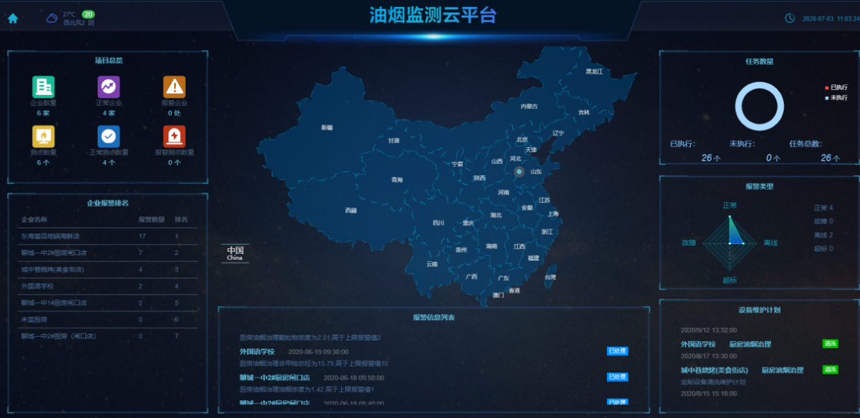 餐饮油烟监测平台GIS地图采集餐饮油烟处理设备运行状态和油烟排放的浓度数据,自动对超标排放及异常企业进行提示预警,监管部门可迅速进行处理,督促餐饮企业整改设备,并定期清洗、维护,实现减排环保,不扰民等目的。