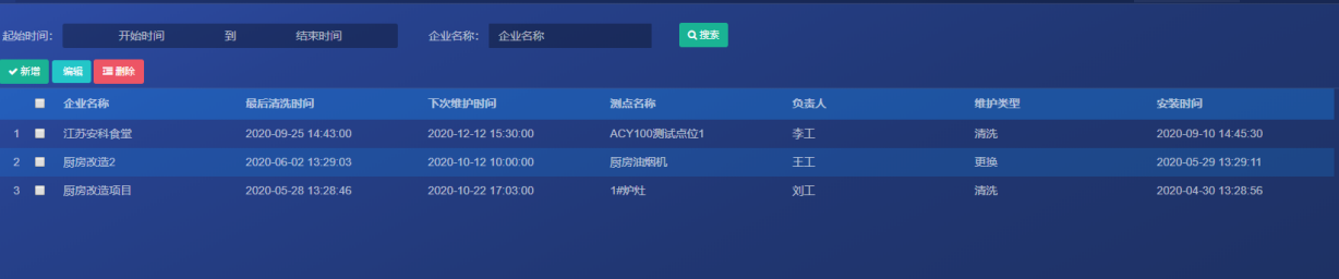 设置企业检测仪定期的清洗、更换计划,包括维护监测点位的安装时间,上一次清洗时间,以及下一次的维护周期,对应的负责人等信息,清洗前/后照片对比。