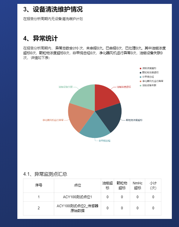 对相关的采集数据油烟、颗粒物、NMHC数据进行关联分析,对超标的种类、企业进行饼状图的展示,同时对报警企业进行排名,根据排名情况对相关企业进行数据和运行状态的分析评价。