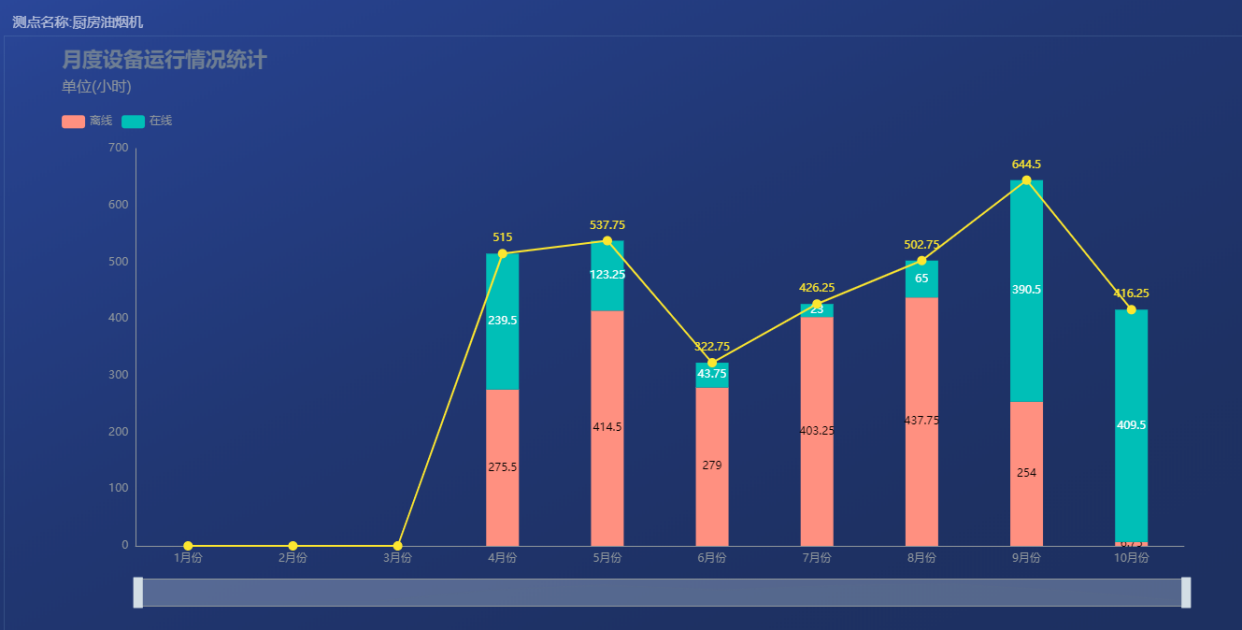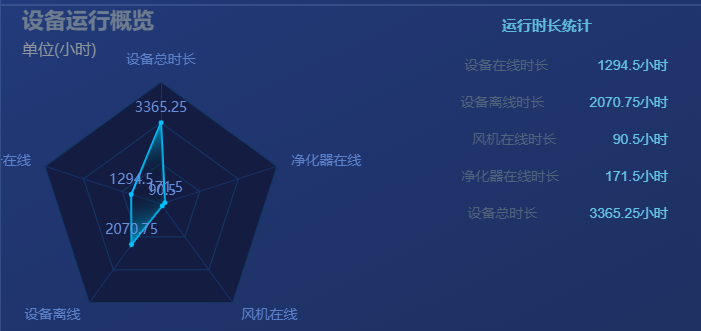 企业在线时长报告模块,将企业目前监测仪的在线时长,失联时长,风机、净化器的在线、离线时间进行汇总,以折线图、雷达图的形式展示。