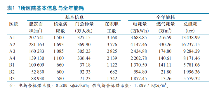 调研的对象是上海市4所综合医院(A1、A2、A3、A4)和3所专科医院(B1、B2、B3),其中B1医院是公共卫生类医院。通过分发调查问卷和实地调研两种方式,以及根据医院后勤管理人员提供的数据以及相关医院的分项计量信息,得到的主要信息除了有7所医院的基本情况(医院类型、等级、总建筑面积、总空调面积、床位数、门急诊量、职工人数等)和2018年的能耗相关数据(电、燃气、自来水等)外,还获得了医院用能设备的信息和设备运行情况等。