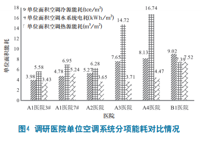 通过调研发现医院A3的空调水系统设备总配置功率达到1102kW,单位面积水系统设备配置功率为11.02W/m2 ,医院A4的空调水系统设备总配置功率达到550 kW,单位面积水系统设备配置功率为10.78 W/m2 ;同比A1医院3#楼的空调水系统设备总配置功率为292kW,单位面积水系统设备配置功率仅为7.12W/m2 ,可见A3医院和A4医院设备选型过大,功率配置过高,这是两所医院单位空调水系统能耗过高的原因。大多医院存在主要能源设备设计选型过大,普遍存在较明显的“大马拉小车"现象,且设备台数不合理,单台设备能力过大,不利于部分负荷调节,既增加初始投资又提高了日常运行成本。从单位面积空调冷源能耗发现,A1医院3#楼的能耗值远低于B1医院。调研发现A1医院3#楼已在2012年实施了空调冷机的节能改造,采用了高效变频的离心式冷水机组,同时采用了高效的真空热水机组作为空调热源设备,而B1医院的空调冷机是2004年生产的定频离心式冷水机组,已投运长达15年,能效衰减较为明显,除此之外该医院还采用低效的燃气蒸汽锅炉作为空调热源设备。从单位面积水系统能耗中发现医院A3和A4的能耗过高与两所医院所用水泵均无变频控制措施有关。无论建筑末端负荷高低,均处于工频运行状态,造成能耗的浪费,而A1医院3#楼则对冷冻水泵和冷却水泵均实施了变频控制,有效降低了水泵运行能耗。因此发现大多医院在选择冷机、锅炉、水泵等时未选用高能效产品,采购设备时偏保守,习惯选用传统的成熟设备,不敢尝试节能高效的新技术、新产品。通过调研发现B1医院属于花园式院区设计,院内均为低矮的建筑且十分分散,在长距离管路输送时管路输送跑冒滴漏损失严重,且汽水换热损失明显,医院锅炉供能系统设计不合理是B1医院空调热源单位能耗大的原因之一。反观B2医院的单位面积综合能耗值,能耗值*低的原因与医院的用能建筑集中有关,没有长距离的冷热媒介质输送损失,且蒸汽发生设备和采暖设备分别采用能耗较高的蒸汽发生器和风冷热泵。