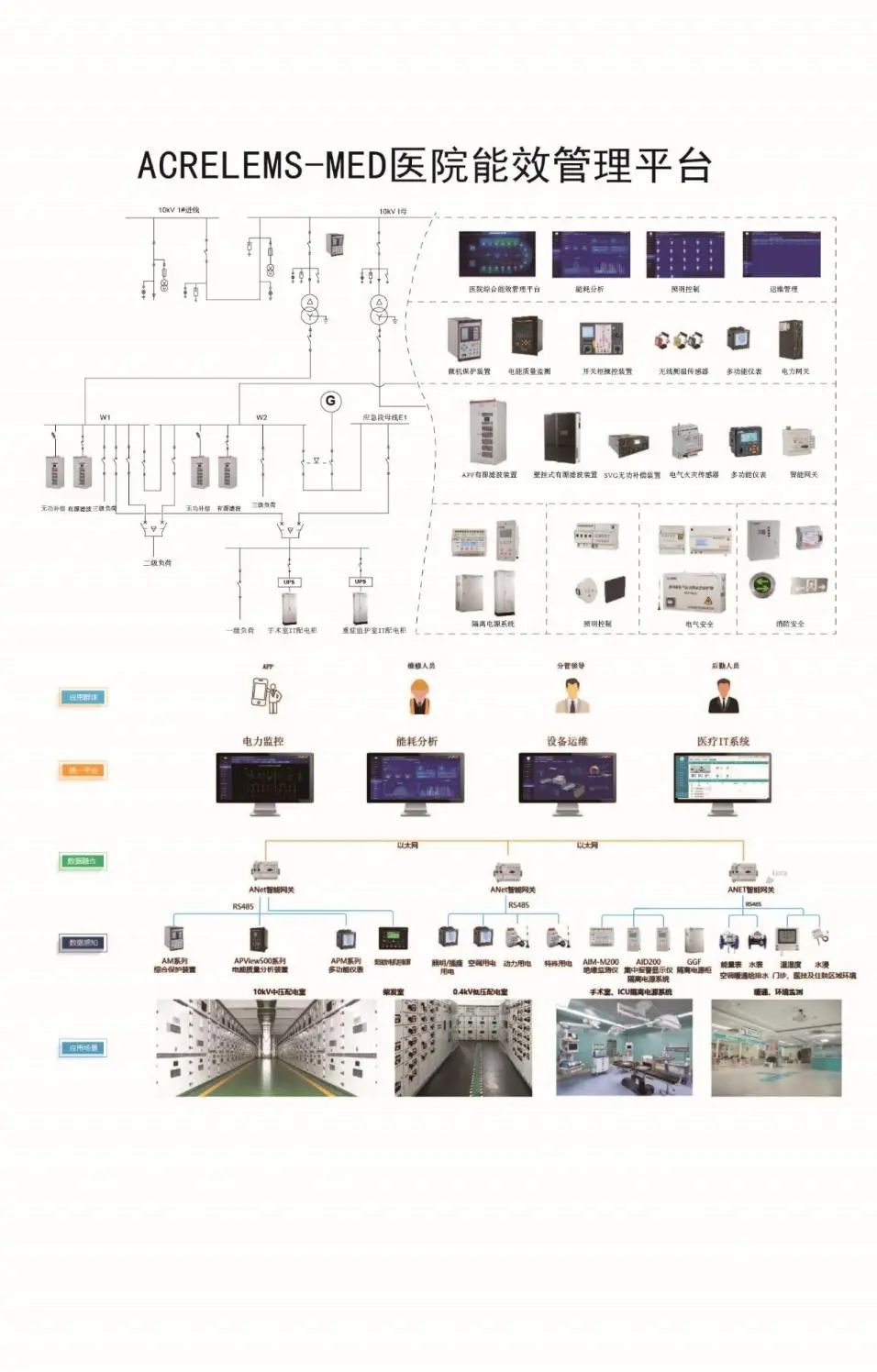 开云官方端网站登录入口医院能源管理系统建立基于云平台的“监、控、维"一体化的能源管理系统,从数据采集、设备控制、数据分析、异常预警、运维派单、系统架构和综合数据服务等方面的设计,帮助医院后勤管理部门全面了解医院能源运行情况,关注消防和电气安全,及时预警异常情况,提高运维效率。它集成了10KV/O.4KV变电站电力监控系统、变电所运维云平台,配电房综合监控系统,能耗管理系统,智能照明控制系统,智慧消防平台,电气火灾监控系统,消防设备电源监控系统,防火门监控系统,消防应急照明和疏散指示系统,充电桩管理系统,电能质量治理解决方案,医疗隔离电源解决方案。