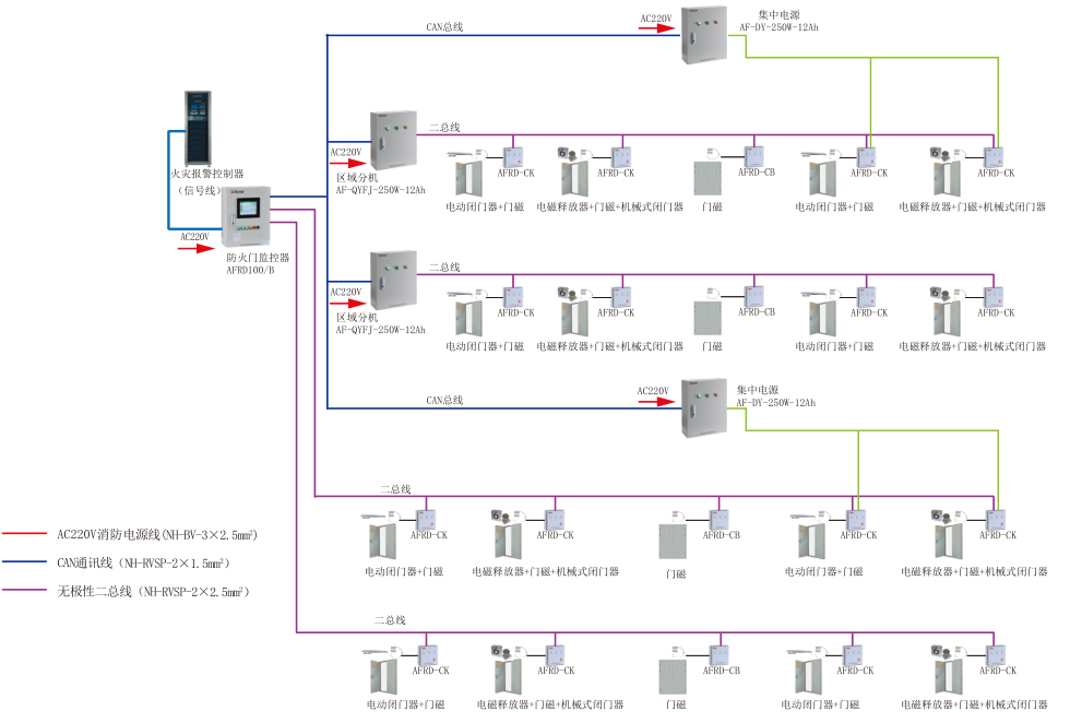 消防设备电源监控监控系统采用消防二总线,以建筑为单位设置区域分机采集消防设备电源状态,区域分机通过二总线接收多台传感器的电压、电流信息和开关状态信息,以此实现对消防设备电源工作状态的实时监视。