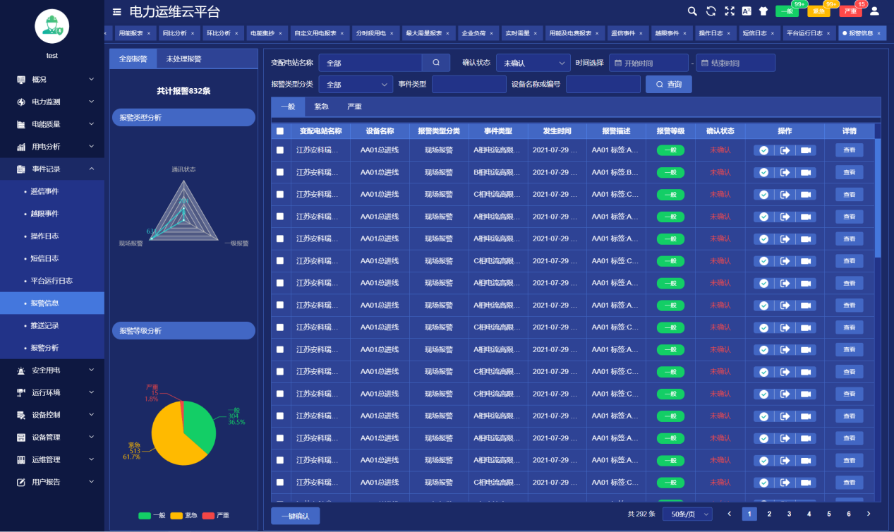AcrelCloud-1000变电所运维云平台基于互联网+、大数据、移动通讯等技术开发的云端管理平台,满足用户或运维公司监测众多变电所回路运行状态和参数、室内环境温湿度、电缆及母线运行温度、现场设备或环境视频场景等需求,实现数据一个中心,集中存储、统一管理,方便使用,支持具有权限的用户通过电脑、手机、PAD等各类终端链接访问、接收报警,并完成有关设备日常和定期巡检和派单等管理工作。