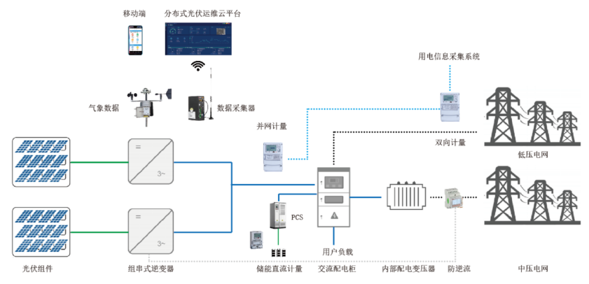 光伏阵列接入组串式光伏逆变器,或者通过汇流箱接入逆变器,然后接入企业380V电网,实现自发自用,余电上网。在380V并网点前需要安装计量电表用于计量光伏发电量,同时在企业电网和公共电网连接处也需要安装双向计量电表,用于计量企业上网电量,数据均应上传供电部门用电信息采集系统,用于光伏发电补贴和上网电量结算。