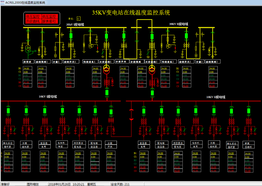 测温系统主机Acrel-2000T安装于值班监控室,可以远程监视系统内所有开关设备运行温度状态。系统具有以下主要功能: