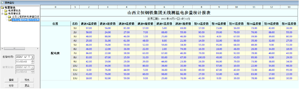运行报表:查询及打印各测温点时间的温度数据。