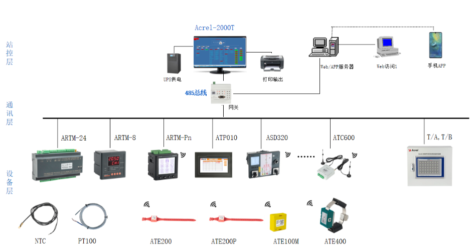 温度在线监测系统主要由设备层的温度传感器和温度采集/显示单元,通讯层的边缘计算网关以及站控层的测温系统主机组成,实现变配电系统关键电气部位的温度在线监测。