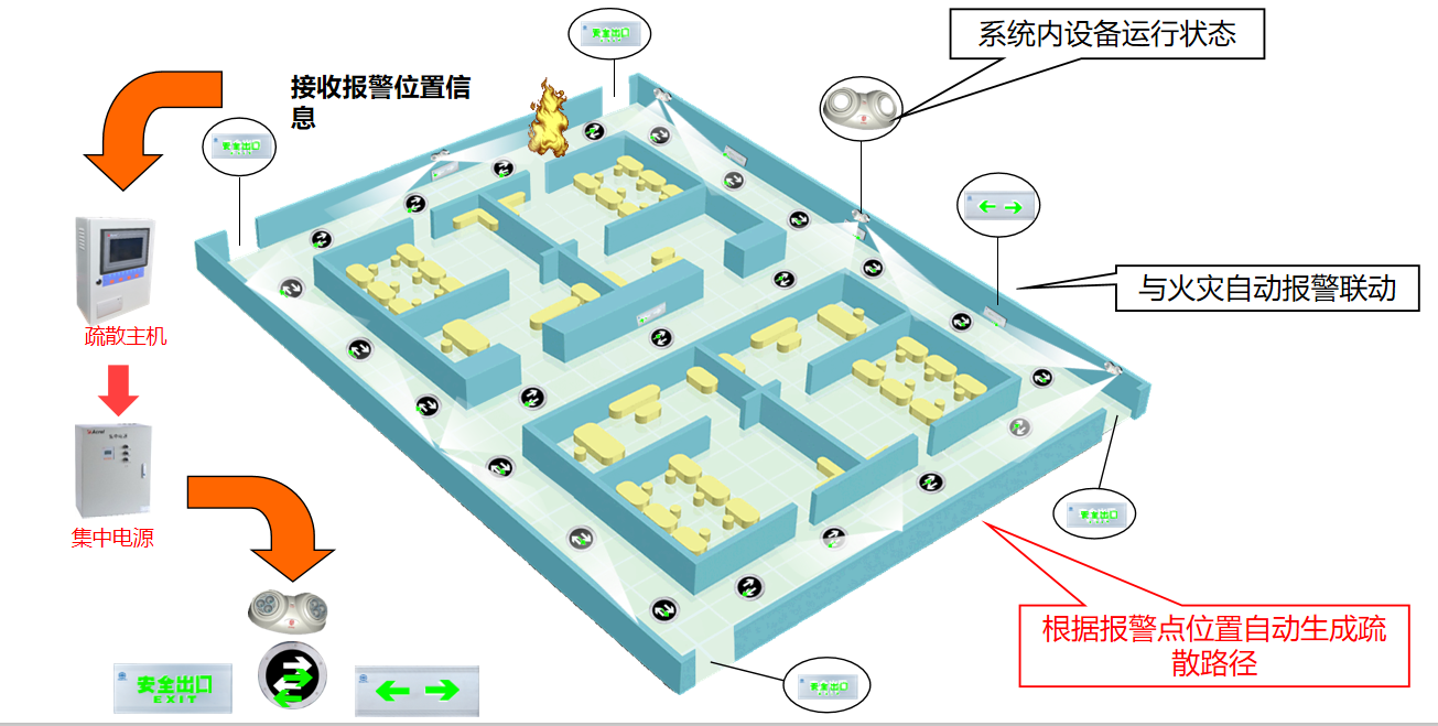 现场共有1台控制器,1台集中电源,合计对9只壁挂单面安全出口、5只壁挂单面左向指示、16只壁挂式应急照明灯具进行监控,与火灾自动报警系统无缝对接,当发生火灾时,得到火灾信息,系统自动生成逃生路线。同时也可以通过自动和手动两种方式进入应急状态。