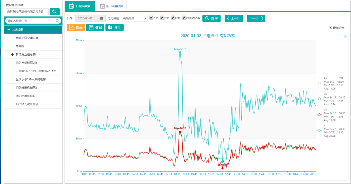 电力监测包括电力数据、变压器监测、运行报表、配电图、电力极值表、运行日报、平均功率因数监视和统计页面。
