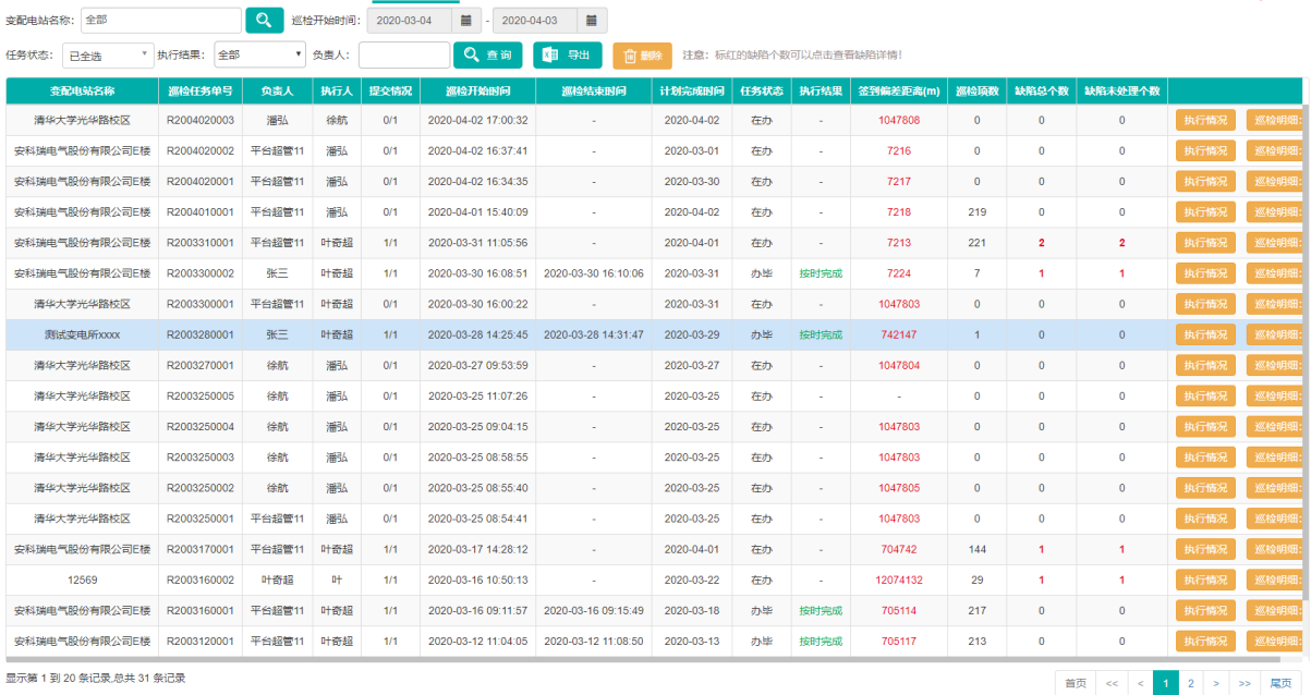 运维管理包括任务管理、巡检记录、缺陷记录三部分,其中任务管理可以完成任务的创建、发布、任务完成情况查询;巡检记录是巡检任务的执行情况和执行明细,缺陷记录是消缺任务创建、发布、完成状态情况查询。