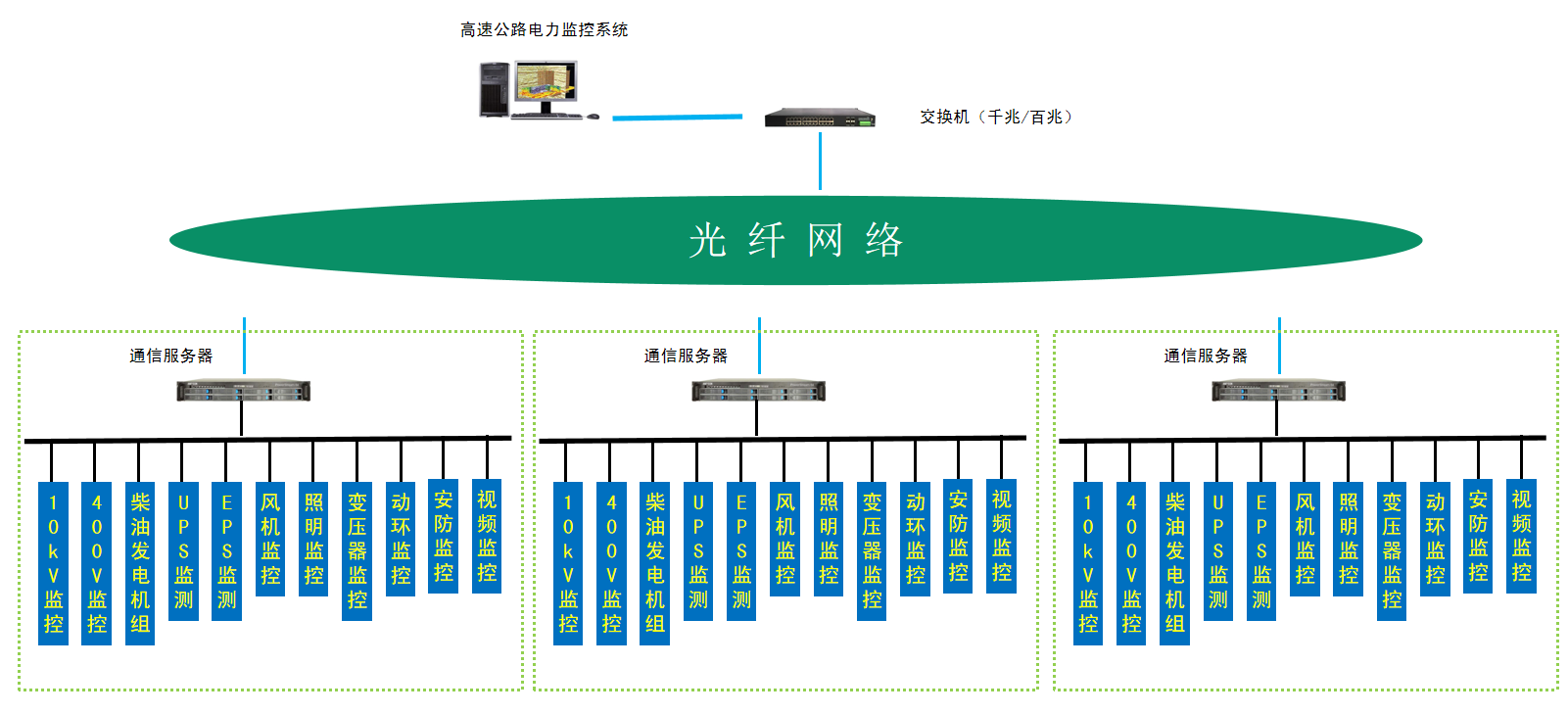 高速公路供配电监控系统包括隧道变电所、服务区变电所、收费站变电所、沿线箱式变电站、互通枢纽、路灯电源、风机控制箱等区域的电力综合监控。