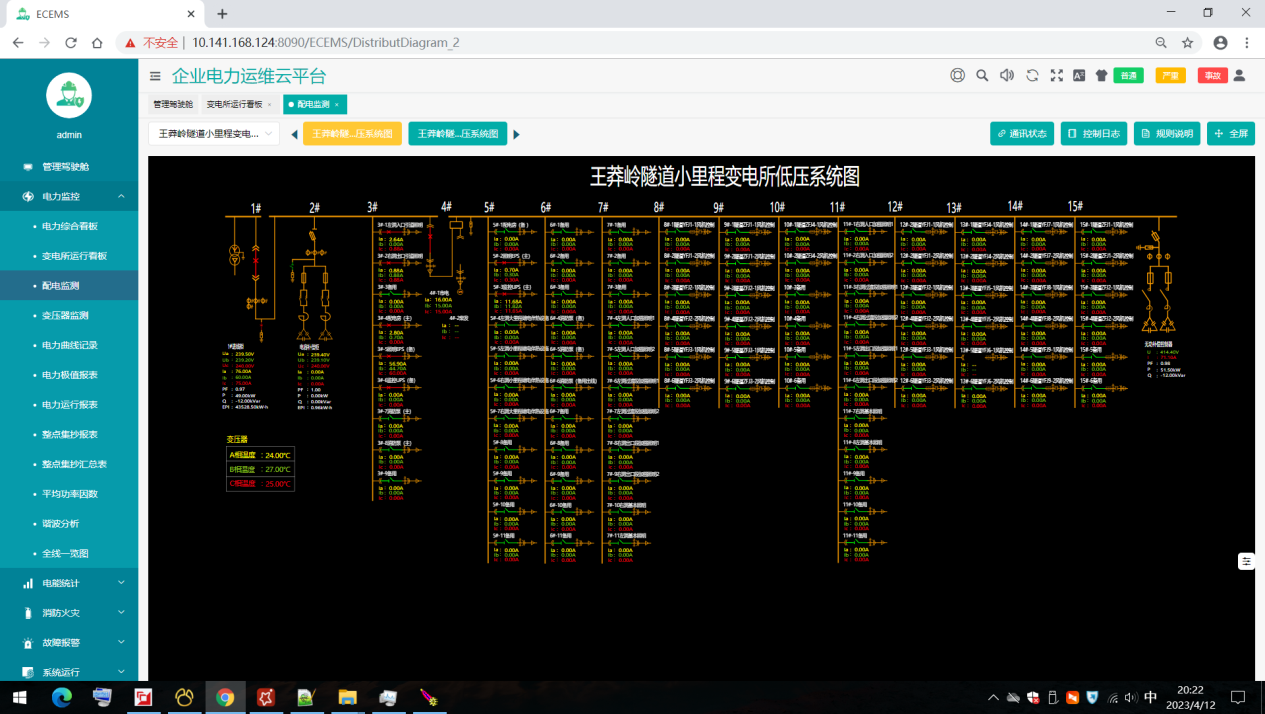 电参量查询:在配电一次图中,可以直接查看该回路详细电参量,包括三相电流、三相电压、总有功功率、总无功功率、总功率因数、正向有功电能等。