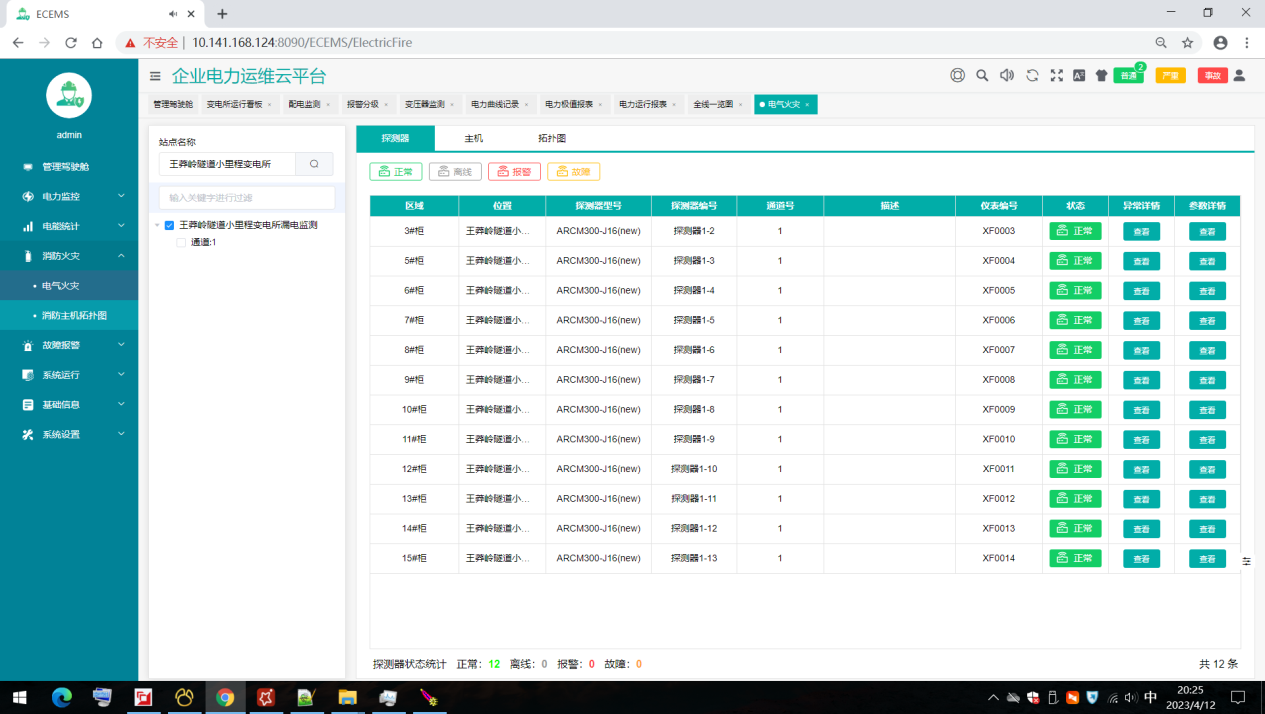 12)电气火灾监测:针对低压用电环节各回路中的剩余电流、温度和故障电弧等进行实施监测;侧重点为低压用电环节的安全性,当剩余电流报警输出,以提醒维护人员进行安全检查,防止因漏电引起的火灾发生,实现对高速公路电气安全预警。