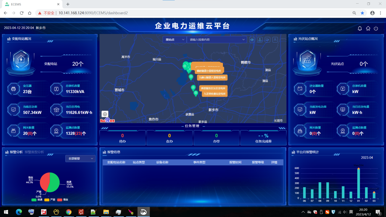 电力综合看板:可查看整个平台的一个概况,包括变电站数量、变电站分布位置;变压器数量、总装机容量,统计出的整个系统当前的总功率和当日的总用电,也可监测网关、仪表的运行状态;展示了接入的光伏站点的信息,包括发电功率和当日发电量;还有运维任务的情况,在办、办毕的个数,统计出任务完成率;报警情况统计,统计出报警程度的分布情况,*新报警滚动显示,平台当月每天的报警数量统计