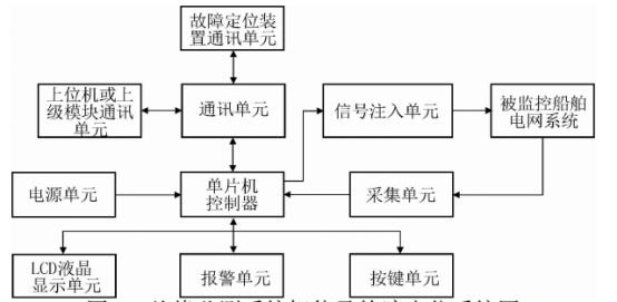 船舶电网系统智能故障定位装置,由信号注入单元向被监测电网系统与地之间注入高幅值低有效值的定位电压信号,与电网故障等效接地点形成通路回路。该电压信号取自电网系统本身,可避免增加额外注入装置并提升抗干扰能力。由采集单元利用高精度漏电流互感器与采集电路进行信号采集与变换并进行放大及滤波算法处理分析,从而判断出被监测电网系统各支路对地绝缘状态并由报警指示单元进行报警指示。其作用是将报警信息传输给绝缘监测装置、触摸屏或上位机系统。每一个智能故障定位装置可实现对各路负载支路在第一次发生故障时自动准确识别定位并及时进行检修。