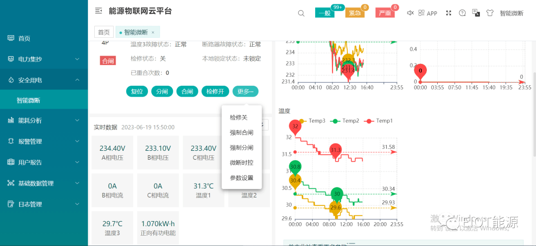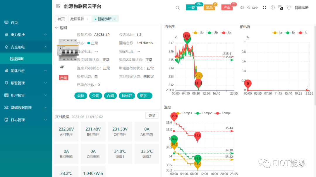 2.平台可展示设备的运行状态、实时数据、各个电参量的历史曲线、报警信息和控制日志;