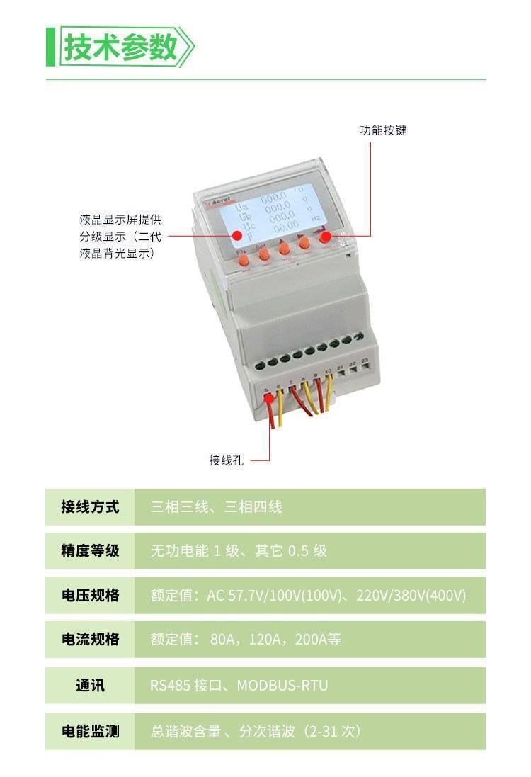 外置开合式互感器的导轨式多功能电力仪表,适用于冶炼、钢铁、电焊、半导体等高能耗行业的节能改造工程,也适用于分布式光伏并网柜的功率监测、电力需求侧管理等应用。具有无需拆一次母线、接线简单方便、施工安全,为用户节约改造成本等特点。它集成全部电力参数的测量(如单相或者三相的电流、电压、有功功率、无功功率、视在功率、频率、功率因数)以及电能监测和考核管理。同时它具有多种外围接口功能可供用户选择:带有RS485通讯接口,采用MODBUS-RTU协议可满足通讯联网管理的需要;带开关量输入和继电器输出可实现断路器开关的“遥信"和“遥控"的功能,采用LCD显示界面,通过面板按键来实现参数设置和控制,非常适合于实时电力监控系统。