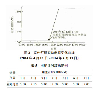 计时功能分中央空调系统运行时间是利用BA系统的启停数据统计空调系统运行时间。照明计时功能是根据有功电能递增斜率判断回路照明的开关状态并统计照明灯具开启时间。如果智能电表仅测量单一回路,如以下室外灯箱照明回路,仅需判断递增斜率大于0即可;如果测量多个回路,需要首先了解每日回路开关组合规律及大致开关时间点,结合回路照明负荷或者历史有功电能变化曲线,确定各开关组合依次开启时功电能的递增斜率,确定合理阀值作为回路开启判断的依据。如果智能电表为单相表,可以直接通过电流的变化来判断照明回路的开关状态。室外灯箱有功电能变化曲线如图2所示。用能计时结果范例如图5所示。