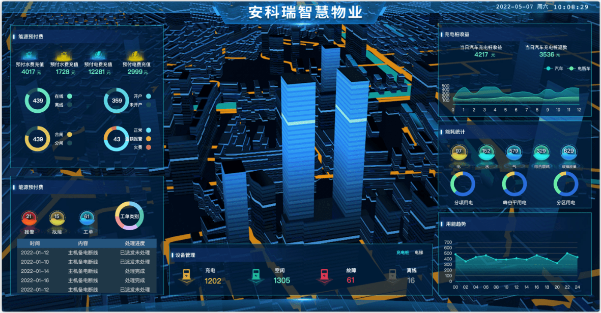 例如下图所示的智慧物业驾驶舱,内容有:预付费、充电桩、电梯、空调、照明等设备管理、能耗统计、收益统计、运维情况等。其中B度地图可以选配成BIM建筑模型,任何传感器报警时可以在BIM模型中预警显示。
