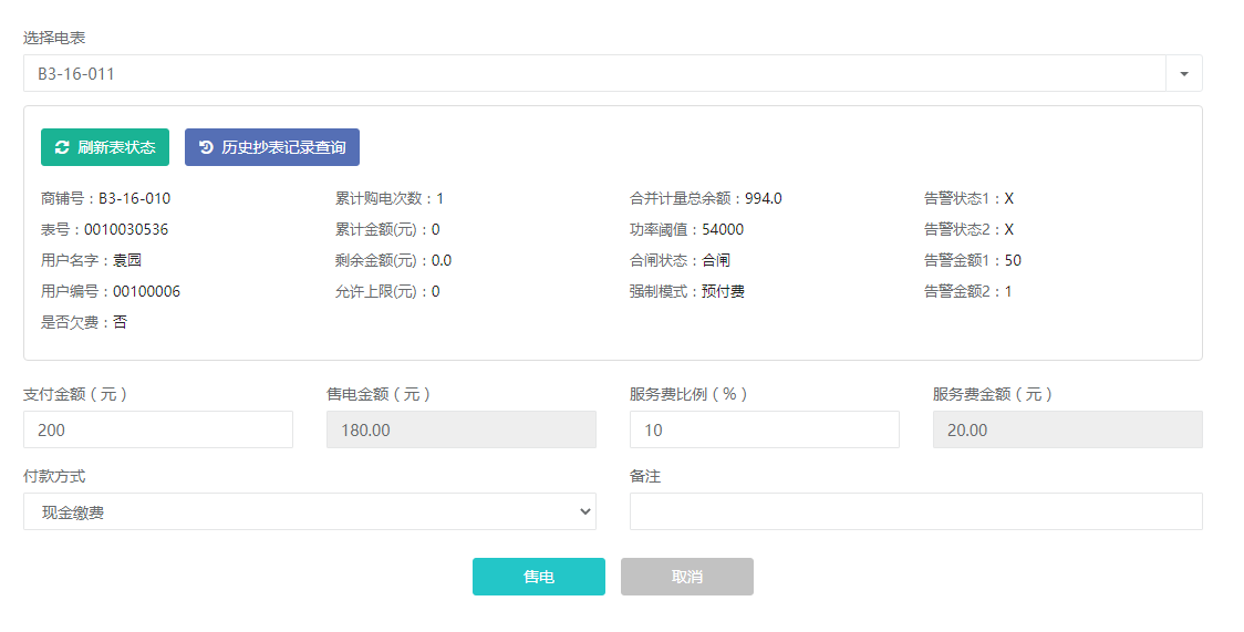 可以对已开户的电表进行远程售电,电费实时下发到电表,电表会根据电度走字实时扣除电费。售电可以设置服务费比例,实际充值到表中的金额将按比例扣除服务费之后再下发,作为物业增加收取服务费的渠道。