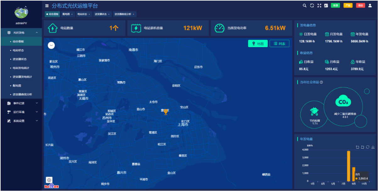 ●显示所有光伏电站的数量,装机容量,实时发电功率。