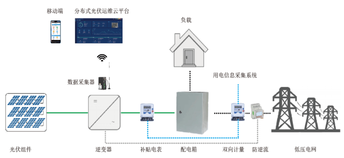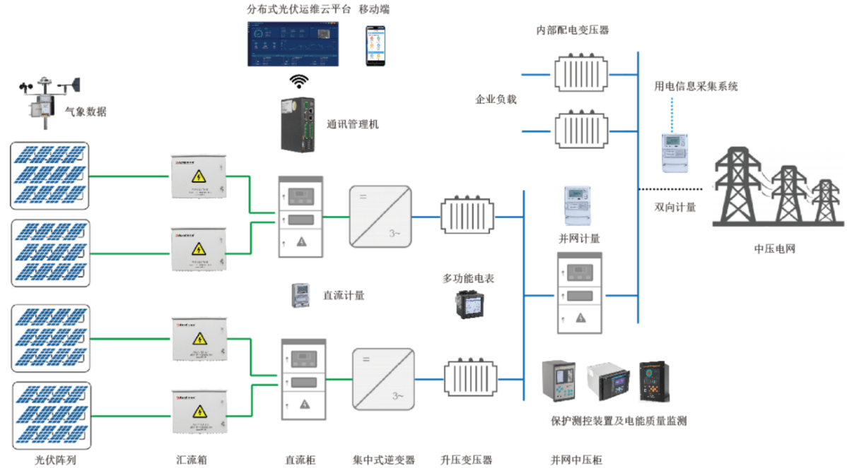 光伏阵列接入组串式光伏逆变器,或者通过汇流箱接入逆变器,然后接入企业380V电网,实现自发自用,余电上网。在380V并网点前需要安装计量电表用于计量光伏发电量,同时在企业电网和公共电网连接处也需要安装双向计量电表,用于计量企业上网电量,数据均应上传供电部门用电信息采集系统,用于光伏发电补贴和上网电量结算。
