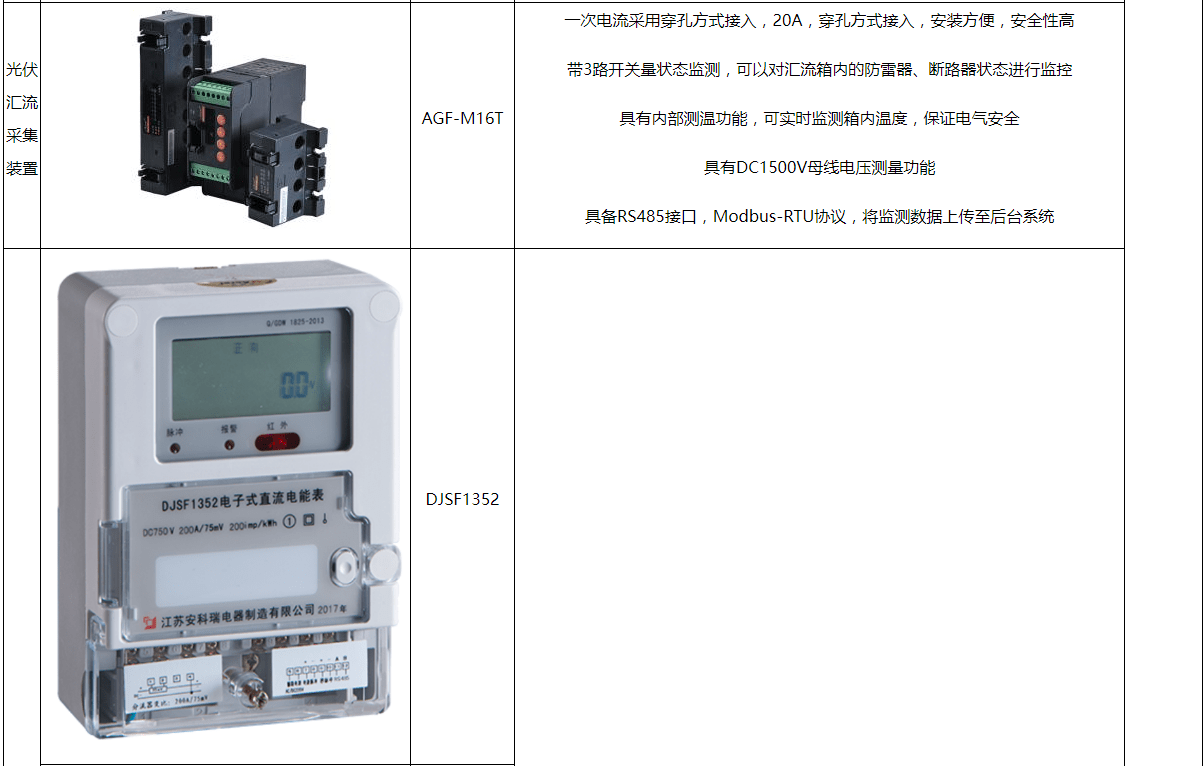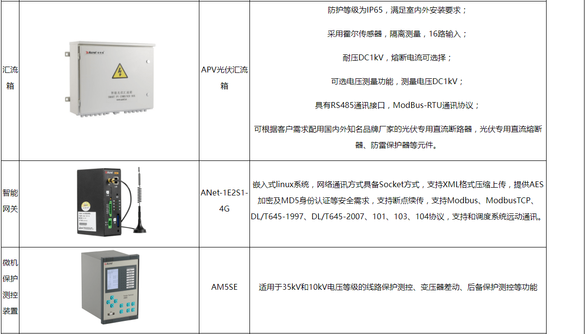 上图为一个1MW分布式光伏电站的示意图,光伏阵列接入光伏汇流箱,经过直流柜汇流后接入集中式逆变器(直流柜根据情况可不设置),最后经过升压变压器升压至10kV或35kV后并入中压电网。由于光伏电站装机容量比较大,涉及到的保护和测控设备比较多,主要如下表: