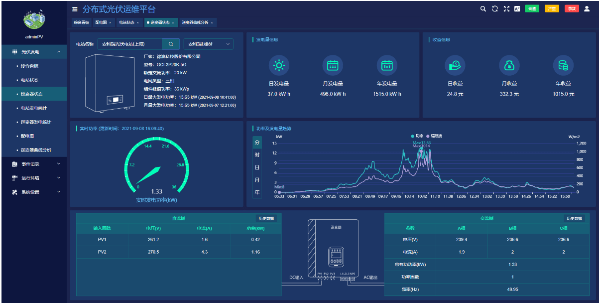 ●电站状态展示当前光伏电站发电功率,补贴电价,峰值功率等基本参数。