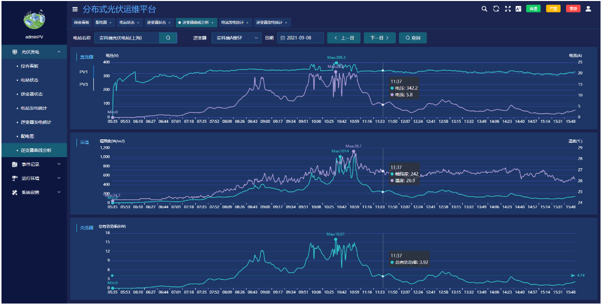 ●展示交、直流侧电压、功率、辐照度、温度曲线。