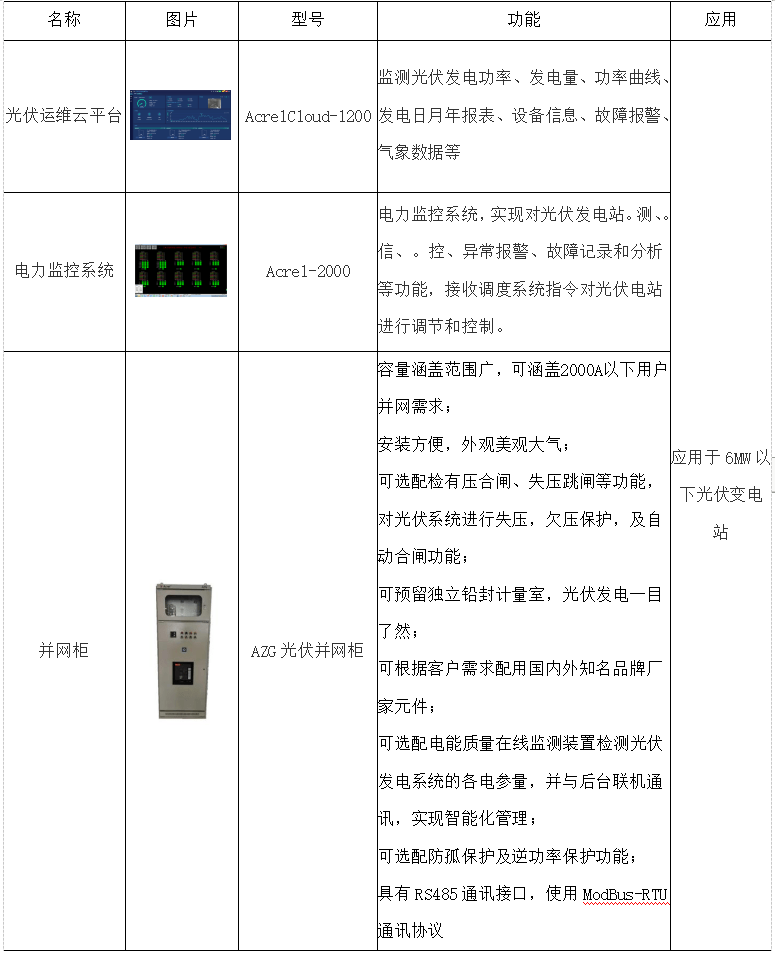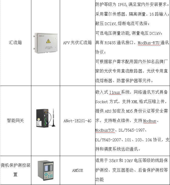 上图为一个1MW分布式光伏电站的示意图,光伏阵列接入光伏汇流箱,经过直流柜汇流后接入集中式逆变器(直流柜根据情况可不设置),最后经过升压变压器升压至10kV或35kV后并入中压电网。由于光伏电站装机容量比较大,涉及到的保护和测控设备比较多,主要如下表: