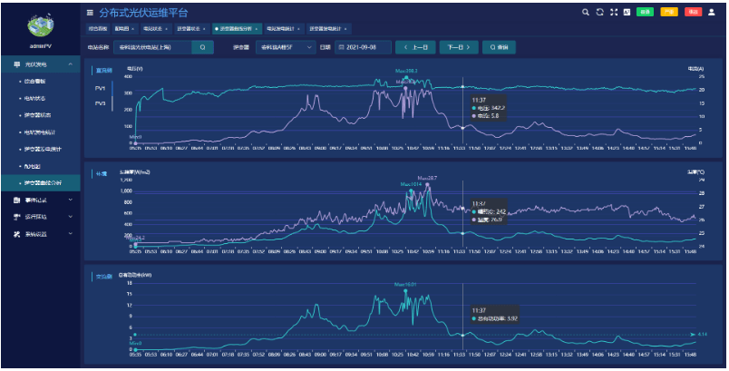 ●展示交、直流侧电压、功率、辐照度、温度曲线。