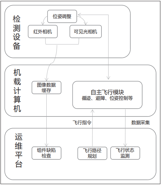 运维平台基于物联网等技术,可以解决无人自动路径最Z置可见光、红外的双光摄像头,让无人机在巡检过程对光伏电站进行拍照、发送,再通过运维平台中应用对照片进行实时处理,就可以实现热斑、积尘、隐裂等等检测项目,大大的节省了人力并提高了效率,无人机巡检系统的结构如图2所示。