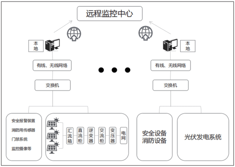 该系统通过各类变送器和传感器来采集光伏电站运行的状态信息,包括光伏组件、汇流箱、逆变器等设备运行数据,计量和保护装置数据以及安全、消防设备信息。再通过有线或无线网络传输的方式将采集到的信息和数据传输至本地监控中心并进行后续处理。