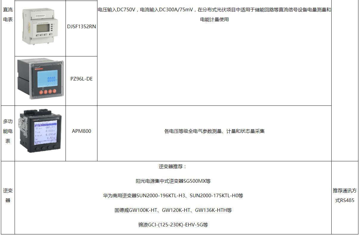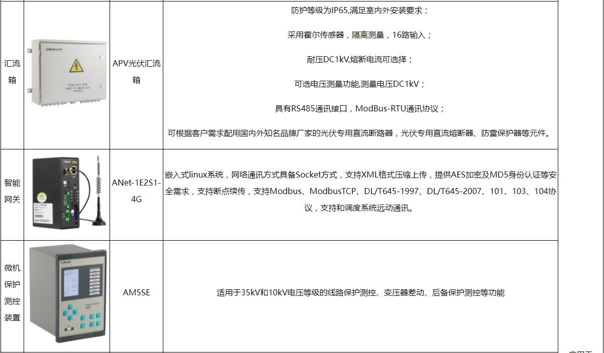 上图为一个1MW分布式光伏电站的示意图,光伏阵列接入光伏汇流箱,经过直流柜汇流后接入集中式逆变器(直流柜根据情况可不设置),最后经过升压变压器升压至10kV或35kV后并入中压电网。由于光伏电站装机容量比较大,涉及到的保护和测控设备比较多,主要如下表: