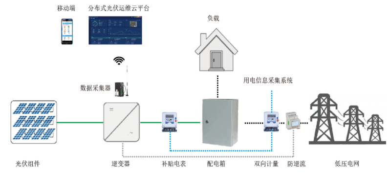 光伏阵列接入组串式光伏逆变器,或者通过汇流箱接入逆变器,然后接入企业380V电网,实现自发自用,余电上网。在380V并网点前需要安装计量电表用于计量光伏发电量,同时在企业电网和公共电网连接处也需要安装双向计量电表,用于计量企业上网电量,数据均应上传供电部门用电信息采集系统,用于光伏发电补贴和上网电量结算。