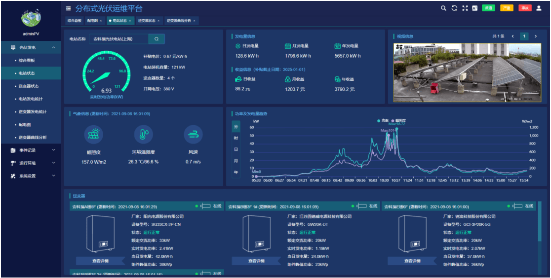 ●视频监控:通过安装在现场的视频摄像头,可以实时监视光伏站运行情况。对于有硬件条件的摄像头,还支持录像回放以及云台控制功能。