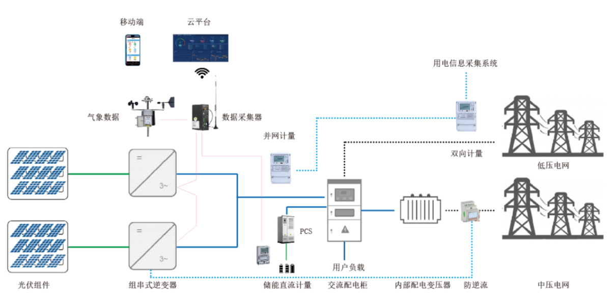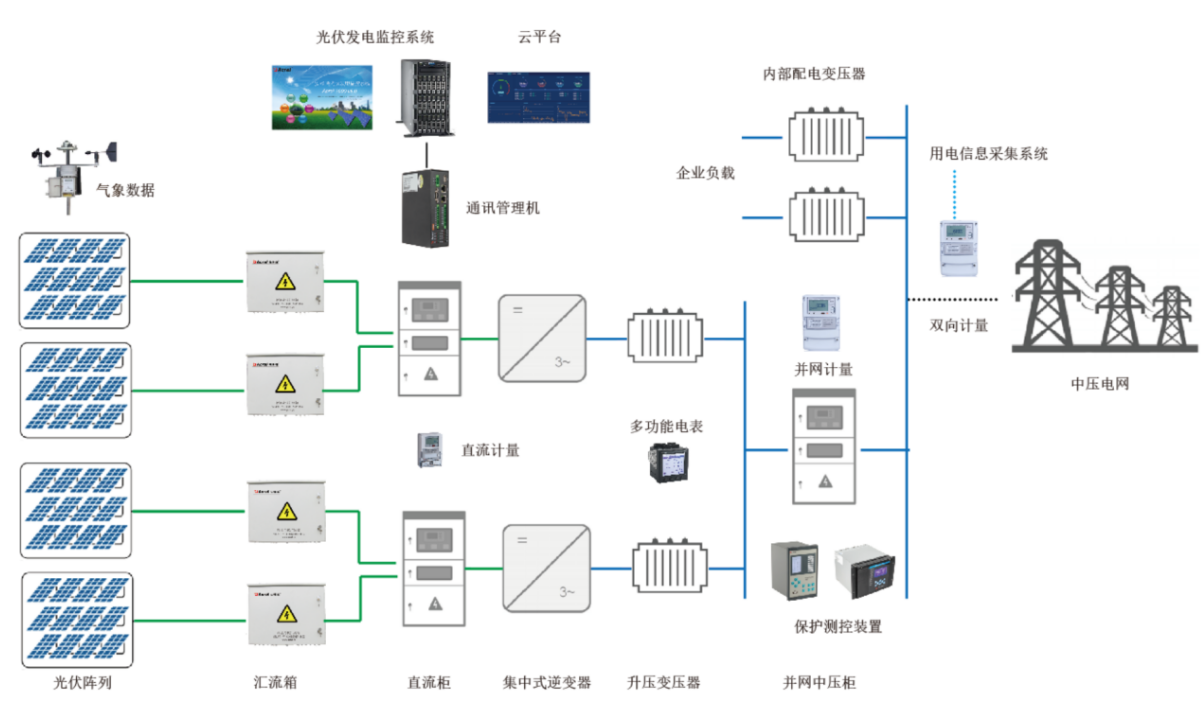 光伏阵列接入组串式光伏逆变器,或者通过汇流箱接入逆变器,然后接入企业380V电网,实现自发自用,余电上网。在380V并网点前需要安装计量电表用于计量光伏发电量,同时在企业电网和公共电网连接处也需要安装双向计量电表,用于计量企业上网电量,数据均应上传供电部门用电信息采集系统,用于光伏发电补贴和上网电量结算。