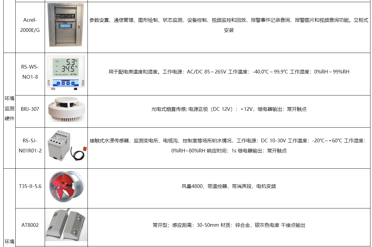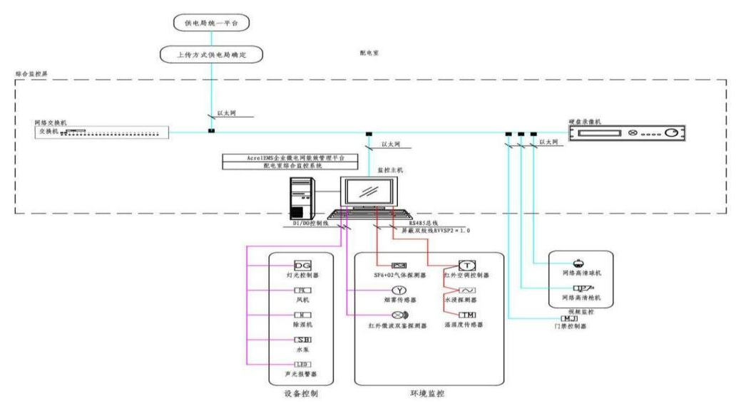 配电室综合监控系统包括智能监控系统屏、通讯管理机、UPS电源、视频监控子系统(云台球机、枪机)、环境监测子系统(温度、湿度、水浸、烟感)、控制子系统(灯光、空调、除湿机、风机、水泵)、门禁监控子系统(读卡器、开门按钮、磁力锁)、安防监控子系统(双鉴检测器)。