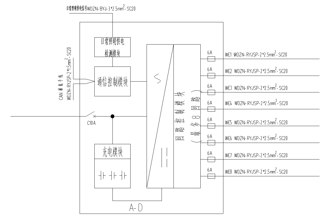 本工程中应急照明控制器至消防应急照明集中电源间采用CAN通讯线WDZN-RYJSP-2X1.5mm²;消防应急照明集中电源至消防应急照明及疏散指示灯具间采用二总线WDZN-RYJSP-2X2.5mm².