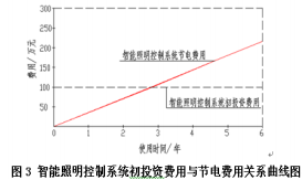 按照表2的数据表明:2X350MW燃煤电厂主厂房和运煤厂房照明用电年节约为95.5万(kW·h),假定上网电价为0.38元/(kW·h),那么每年可节约电费为36.3万元,而主厂房和运煤系统厂房增加一套智能照明控制系统约需100万(含智能照明配电箱、系统软件、控制设备及通讯管理硬件设备等)投资,那么只要3年的时间就可保证节约的电费与初投资均衡,运行超过3年以上,智能照明控制系统的经济性会随着时间的加长凸显。详见图3。